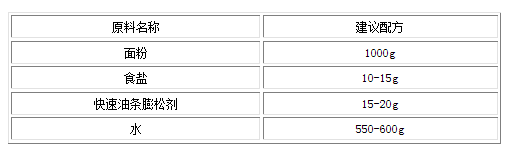 把油條復(fù)合膨松劑加入面粉中混合均勻,再把食鹽溶解在水中和面至面團(tuán)光滑,靜置醒面約30分鐘,即可成型、炸制。 提示:冬季可以用50-60℃的溫水和面;為了使炸出的油條效果更好,可以把和好的面團(tuán)間隔10分鐘左右再揉制一至二次然后醒發(fā);醒發(fā)好的面團(tuán)不要再揉制,以防筋度過(guò)強(qiáng)不易拉伸成型;快速油條復(fù)合膨松劑也適合傳統(tǒng)油條制作方法。 |
